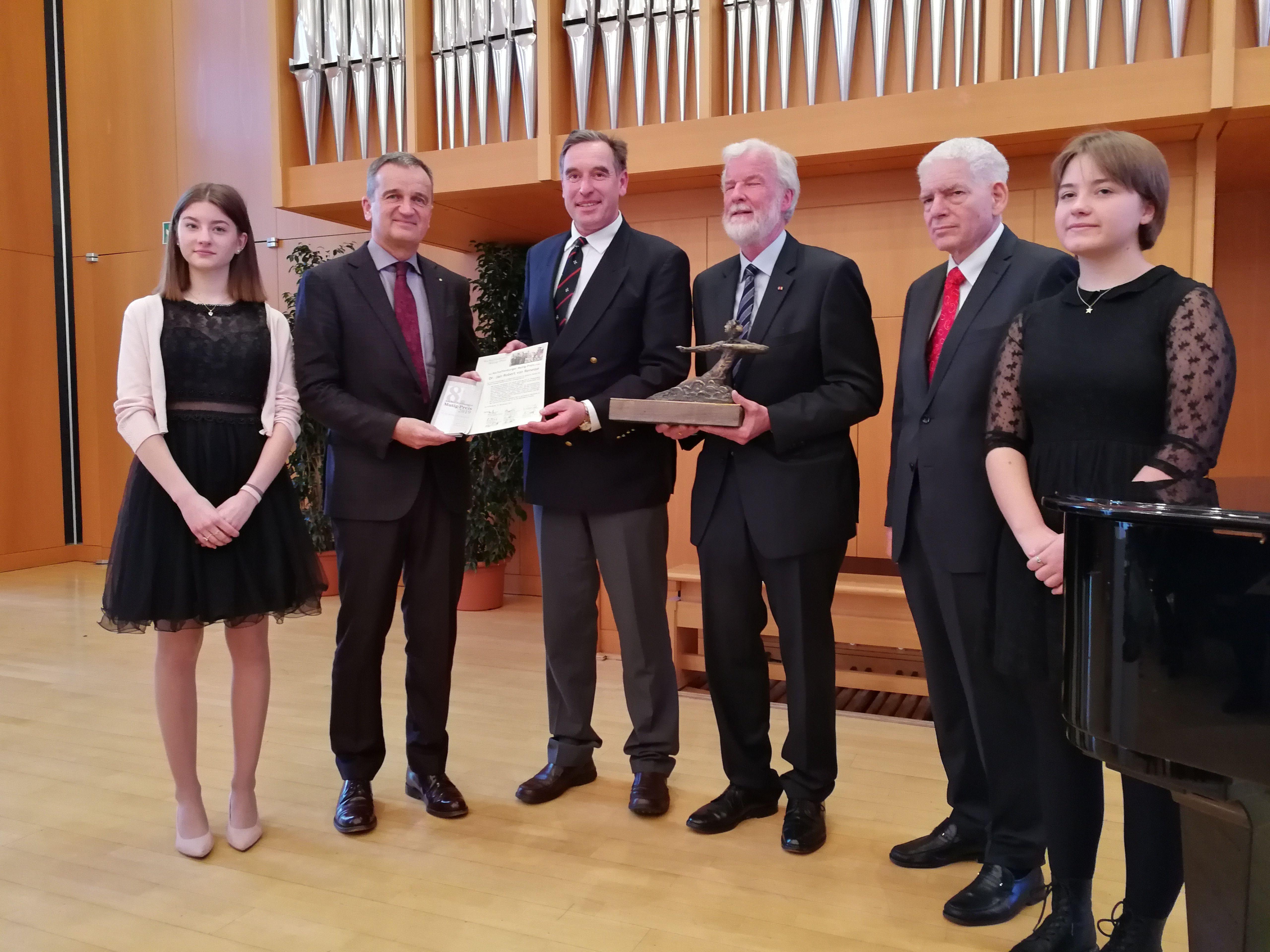 Begegnungen von Schülerinnen und Schülern des Dalberg-Gymnasiums mit dem Preisträger des Aschaffenburger Mutig-Preises Don Luigi Ciotti (v.l.n.r.: Wolfgang Gärthe, Susanne Leeb, Don Luigi Ciotti, Lena Meier, Maria Pia Pintagro Gallarizzo, OStD Georg Fath) Foto: Thomas Beer, Dalberg-Gymnasium